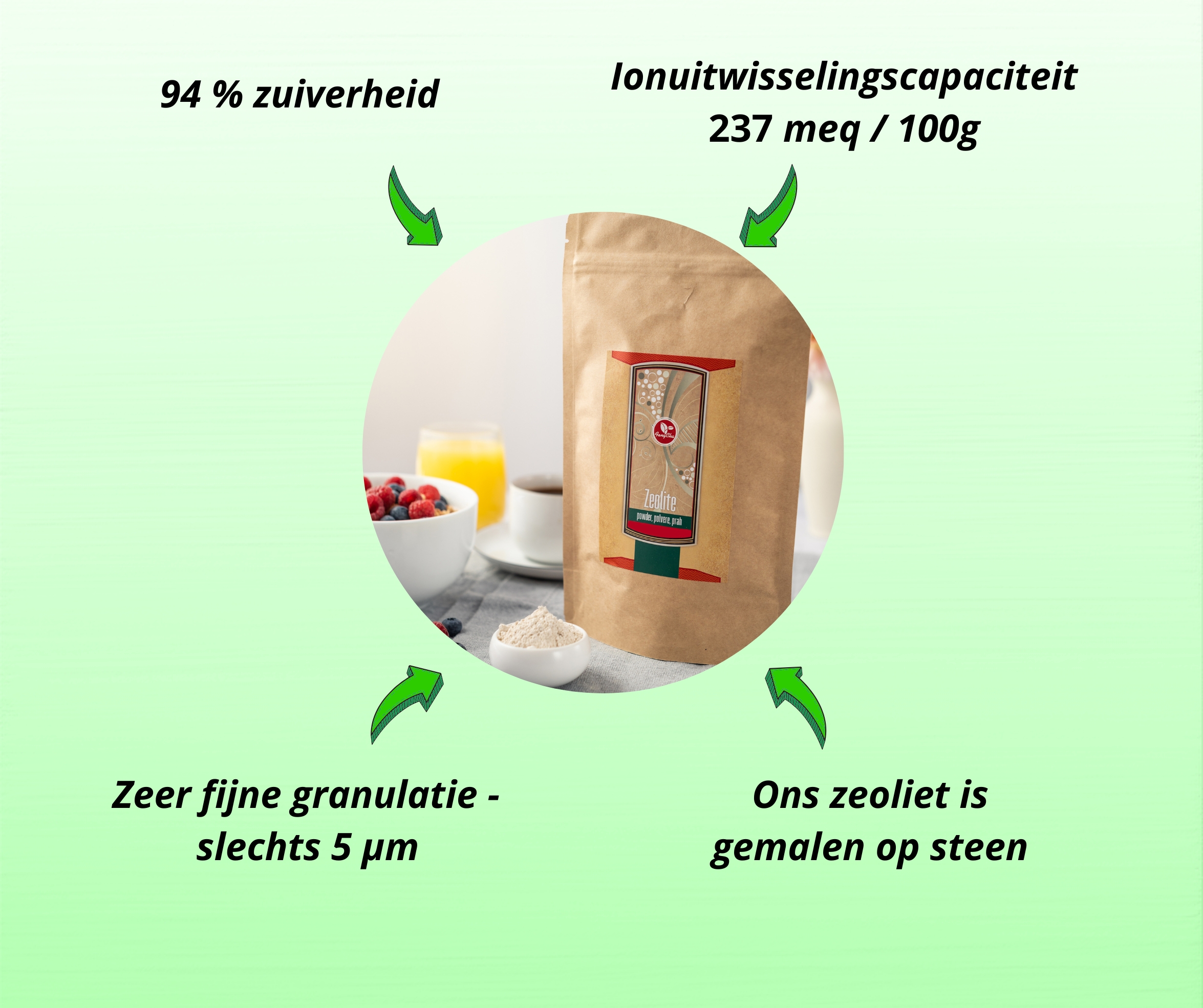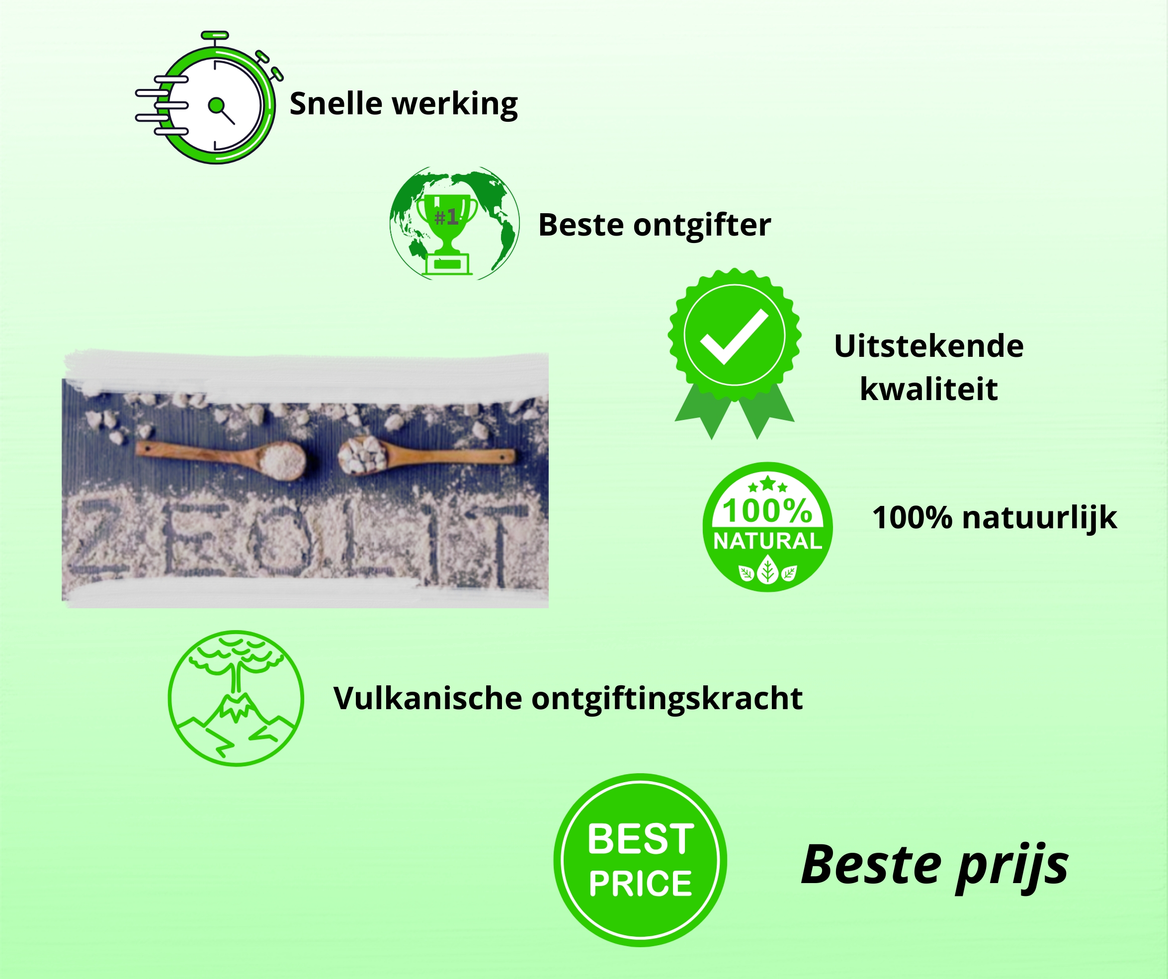 Vulkanisch gesteente zeoliet is een van de krachtigste natuurlijke ontgifters ter wereld. Het natuurlijke rotszeoliet, in de vorm van het eetbare vulkanische mineraal clinoptiloliet, helpt het lichaam te reinigen van gifstoffen uit het milieu en uit de voeding.