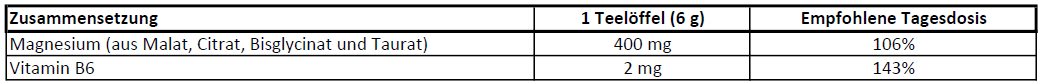Inulin aus der Zichorienwurzel (Cichorium intybus), Magnesiummalat, Säureregulator (Zitronensäure), Magnesiumsalze der Zitronensäure, Magnesiumbisglycinat, Magnesiumtaurat, natürliche Aromen, Farbstoffkonzentrat aus Rote Beete, Süßungsmittel (Sucralose), Farbstoff (Riboflavin), Vitamin B6 (Pyridoxin-Hydrochlorid).