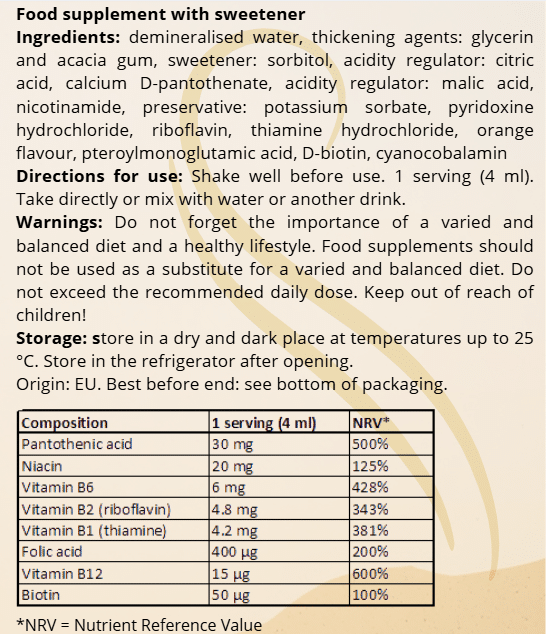 Demineralisoitu vesi, sakeutusaineet: glyseriini ja arabikumi, makeutusaine: sorbitoli, happamuudensäätöaine: sitruunahappo, kalsium-D-pantotenaatti, happamuudensäätöaine: omenahappo, nikotiiniamidi, säilöntäaine: kaliumsorbaatti, pyridoksiinihydrokloridi, riboflaviini, tiamiinihydrokloridi, appelsiiniaromi, pteroyylimonoglutamiinihappo, D-biotiini, syanokobalamiini
