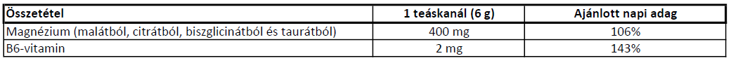 Cikória gyökér inulint (Cichorium intybus), magnézium-málát, savanyúság szabályozót (citromsav), magnézium-citrátot, magnézium-biszglizinátot, magnézium-taurátot, természetes aromákat, céklakivonat színezéket, édesítőszert (szukralóz), színezéket (riboflavin), B6-vitamint (piridoxin-hidroklorid).