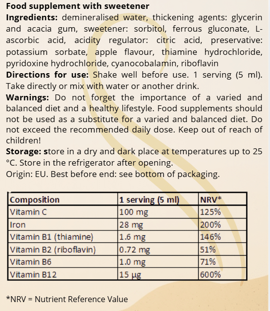 Demineralizált víz, sűrítőanyagok: glicerin és arabgumi, édesítőszer: szorbit, vas-glukonát, L-aszkorbinsav, savanyúságot szabályozó anyag: citromsav, tartósítószer: kálium-szorbát, alma aroma, tiamin-hidroklorid, piridoxin-hidroklorid, cianokobalamin, riboflavin