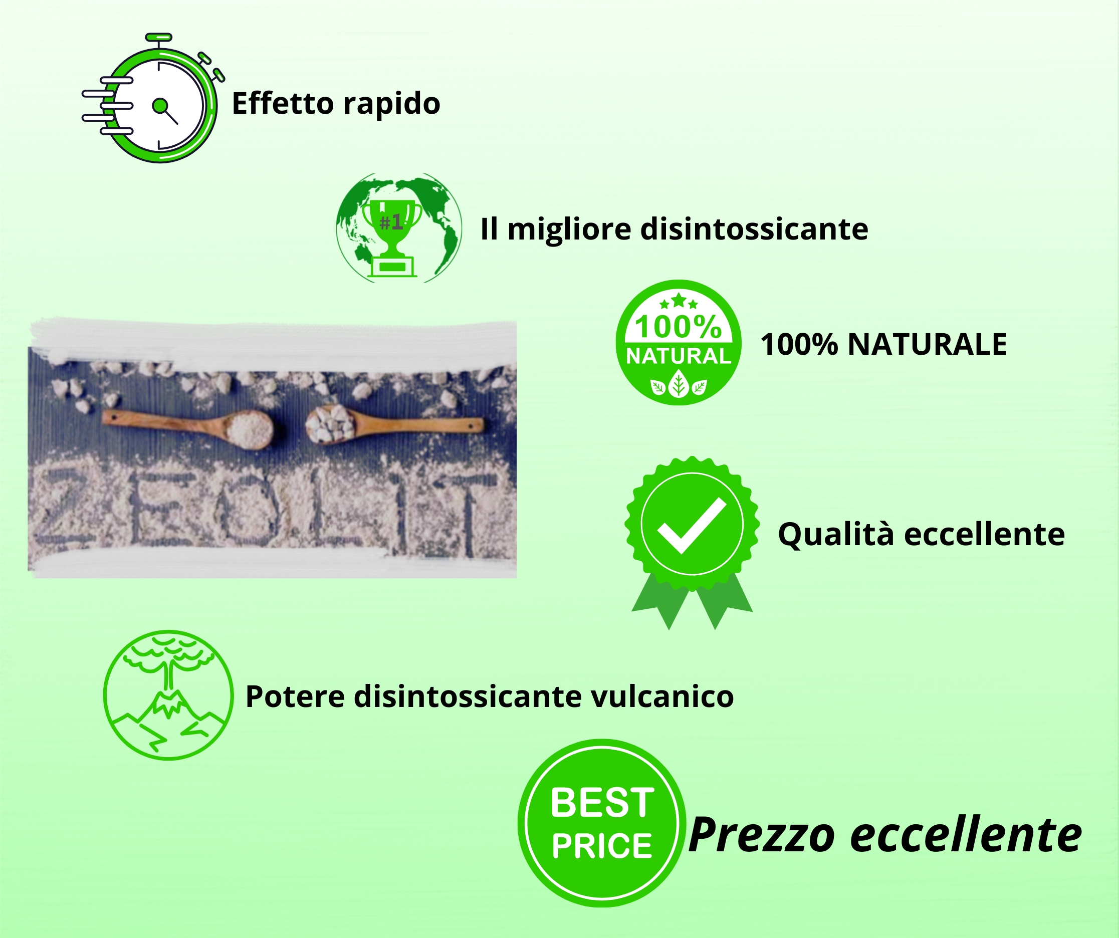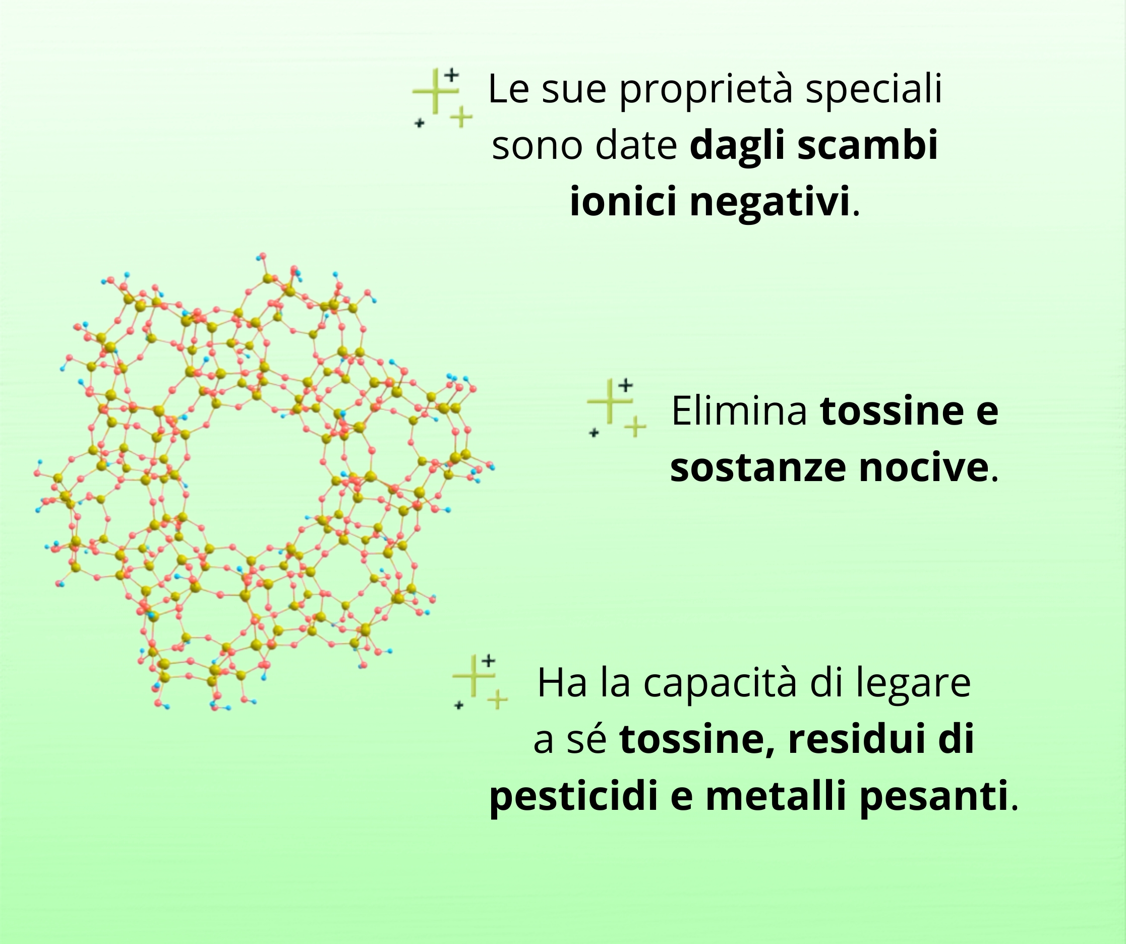 È stata creata nel periodo delle grandi eruzioni vulcaniche ed ha la capacità di legare i veleni, i resti dei pesticidi e i metalli pesanti nel corpo. Rappresenta un’ottima alternativa ad alcuni medicinali. Esistono diversi tipi di zeoliti, tra i quali la forma cristallina clinoptilolite è la più apprezzata e ricercata. I cristalli contengono minerali vitali come sodio, calcio, potassio, magnesio, ferro e altri elementi.