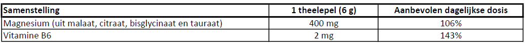 Inuline uit cichoreiwortel (Cichorium intybus), magnesiummaaltaat, zuurteregelaar (citroenzuur), magnesiumzouten van citroenzuur, magnesiumbisglycinaat, magnesiumtauraat, natuurlijke aromaβs, kleurconcentraat van biet, zoetstof (sucralose), kleurstof (riboflavine), vitamine B6 (pyridoxinehydrochloride).