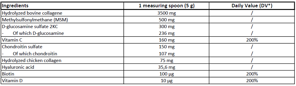 Hydrolyzed bovine collagen type I, methylsulfonylmethane (MSM), D-glucosamine sulfate 2KCl, acidity regulator (citric acid), chondroitin sulfate, vitamin C (L-ascorbic acid), natural flavoring, hydrolyzed chicken collagen type II, sodium hyaluronate, sweetener (sucralose), coloring (riboflavin), vitamin D3 (cholecalciferol), D-biotin.