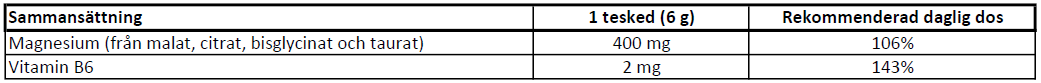Inulin från cikoriarot (Cichorium intybus), magnesiummalat, surhetsreglerande medel (citronsyra), magnesiumsalter från citronsyra, magnesiumbisglycinat, magnesiumtaurat, naturliga aromer, färgämne från rödbetor, sötningsmedel (sukralos), färgämne (riboflavin), vitamin B6 (pyridoxinhydroklorid).